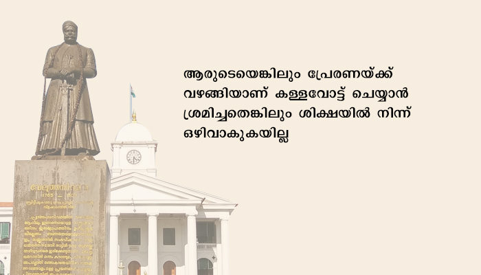 മലപ്പുറം: മറ്റൊരാളുടെ വോട്ട് ചെയ്യാന് ശ്രമിക്കുകയോ തന്റെ തന്നെ വോട്ട് മുമ്പ് ചെയ്ത വിവരം മറച്ച് വെച്ച് വീണ്ടും വോട്ട് ചെയ്യാന് ശ്രമിക്കയോ ചെയ്യുന്നത് ജന പ്രാതിനിത്യ നിയമമനുസരിച്ചും ഇന്ത്യന് ശിക്ഷാ നിയമമനുസരിച്ചം കുറ്റകരമാണ്. ഐ.പി.സി. 171 എഫ് അനുസരിച്ച് ഒരു വര്ഷം വരെ തടവും പിഴയും ലഭിക്കാവുന്ന കുറ്റകൃത്യമാണ്. ആരുടെയെങ്കിലും പ്രേരണയ്ക്ക് വഴങ്ങിയാണ് കള്ളവോട്ട് ചെയ്യാന് ശ്രമിച്ചതെങ്കിലും ശിക്ഷയില് നിന്ന് ഴെിവാകുകയില്ല. മറ്റൊരാളുടെ തിരിച്ചറിയല് രേഖ വ്യാജമായിട്ട് ഉണ്ടാക്കിയാണ് വോട്ട് ചെയ്യാന് ശ്രമിച്ചതെങ്കില് വ്യാജരേഖ ചമച്ചതിനും ആള്മാറാട്ടം നടത്തിയതിനും കൂടി കേസ് രജിസ്റ്റര് ചെയ്യും. കള്ള വോട്ട് ചെയ്യാന് ശ്രമിക്കുന്നവര്ക്കെതിരെ കര്ശന നടപടിയുണ്ടാവുമെന്നു ജില്ലാ കളക്ടർ കെ ഗോപാലകൃഷ്ണന് അറിയിച്ചു.