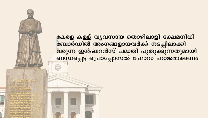 കേരള കള്ള് വ്യവസായ തൊഴിലാളി ക്ഷേമനിധി ബോർഡിൽ അംഗങ്ങളായവർക്ക് നടപ്പിലാക്കി വരുന്ന ഇൻഷ്വറൻസ് പദ്ധതി പുതുക്കുന്നതുമായി ബന്ധപ്പെട്ട പ്രൊപ്പോസൽ ഫോറം ഹാജരാക്കണം. തിരുവനന്തപുരം ജില്ലയിൽ നിലവിൽ പ്രവർത്തിക്കുന്ന കള്ള് ഷോപ്പുകളിലെ തൊഴിലാളികളിൽ പ്രൊപ്പോസൽ ഫോറം ഇതുവരെ ഹാജരാക്കാത്തവർ 15നു മുൻപ് ഹാജരാക്കണം. കൂടുതൽ വിവരങ്ങൾക്ക് തിരുവനന്തപുരം ജില്ലാ വെൽഫെയർ ഫണ്ട് ഇൻസ്പെക്ടർ ഓഫീസുമായി ബന്ധപ്പെടുക. ഫോൺ: 0471-2448451.