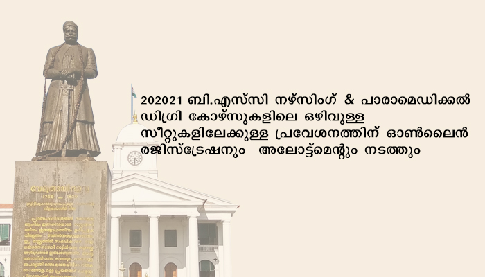 2020-21 ബി.എസ്സി നഴ്സിംഗ് & പാരാമെഡിക്കൽ ഡിഗ്രി കോഴ്സുകളിലെ ഒഴിവുള്ള സീറ്റുകളിലേക്കുള്ള പ്രവേശനത്തിന് ഓൺലൈൻ രജിസ്ട്രേഷനും അലോട്ട്മെന്റും നടത്തും. എസ്.സി/എസ്.ടി വിഭാഗക്കാർക്ക് മാത്രമായി ഡിസംബർ 17നും ജനറൽ വിഭാഗക്കാർക്ക് (എല്ലാ വിഭാഗക്കാർക്കും) 19നുമാണ് നിശ്ചയിച്ചിരിക്കുന്നത്. 17ന് അലോട്ട്മെന്റിൽ പങ്കെടുക്കേണ്ടവർ 16നും 19ന് അലോട്ട്മെന്റിൽ പങ്കെടുക്കേണ്ടവർ 18നും കോളേജ് ഓപ്ഷൻ നൽകി രജിസ്റ്റർ ചെയ്യണം. ഓൺലൈനായിട്ടാവും അലോട്ട്മെന്റ്. അതത് ദിവസം രജിസ്റ്റർ ചെയ്തിട്ടുള്ളവരെ മാത്രമേ അലോട്ട്മെന്റിന് പരിഗണിക്കൂ. സ്വാശ്രയ കോളേജുകളിൽ പ്രവേശനം നേടിയവർക്ക് എൻ.ഒ.സി. നിർബന്ധമാണ്. അലോട്ട്മെന്റ് ലഭിച്ചവർ ഫീസ് അടച്ച് നിശ്ചിത തിയതിക്കുള്ളിൽ കോളേജിൽ പ്രവേശനം നേടണം. കൂടുതൽ വിവരങ്ങൾക്ക്: 0471-2560363, 364.