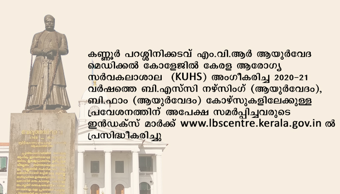 കണ്ണൂർ പറശ്ശിനിക്കടവ് എം.വി.ആർ ആയുർവേദ മെഡിക്കൽ കോളേജിൽ കേരള ആരോഗ്യ സർവകലാശാല (KUHS) അംഗീകരിച്ച 2020-21 വർഷത്തെ ബി.എസ്സി നഴ്സിംഗ് (ആയുർവേദം), ബി.ഫാം (ആയുർവേദം) കോഴ്സുകളിലേക്കുള്ള പ്രവേശനത്തിന് അപേക്ഷ സമർപ്പിച്ചവരുടെ ഇൻഡക്സ് മാർക്ക് www.lbscentre.kerala.gov.in ൽ പ്രസിദ്ധീകരിച്ചു. കൂടുതൽ വിവരങ്ങൾക്ക്: 0471-2560363, 364.