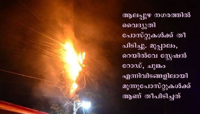 ആലപ്പുഴ: ആലപ്പുഴ നഗരത്തില് വൈദ്യുതി പോസ്റ്റുകള്ക്ക് തീ പിടിച്ചു. മുപ്പാലം, റെയില്വേ സ്റ്റേഷന് റോഡ്, ചുങ്കം എന്നിവിടങ്ങളിലായി മൂന്നുപോസ്റ്റുകള്ക്കാണ് തീപിടിച്ചത്. മുപ്പാലത്തിനടുത്ത് ഉച്ചക്ക 2.45 ന് ബാലൂസ് ഹേട്ട്ലിന് സമീപത്തെ പോസ്റ്റിലാണ് തീപിടുത്തമുണ്ടായത്. രാംചരണ് കമ്പനിയുടെ കെട്ടിടത്തിലേക്ക് തീ പടര്ന്നെങ്കിലും ഫയര്ഫോഴ്സെത്തി തീയണച്ചു.