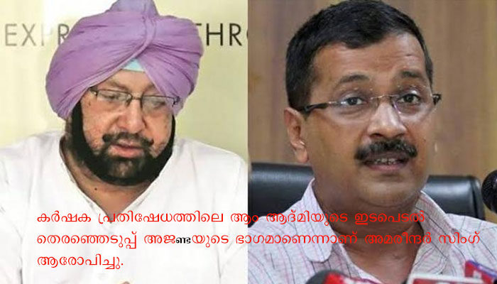 അമൃത്സര്‍: ആം ആദ്മി പാർടിക്കും ഡല്‍ഹി മുഖ്യമന്ത്രി അരവിന്ദ് കെജ്‌രിവാളിനെതിരെ പഞ്ചാബ് മുഖ്യമന്ത്രി അമരീന്ദര്‍ സിംഗ്.കര്‍ഷക പ്രതിഷേധത്തിലെ ആം ആദ്മിയുടെ ഇടപെടല്‍ തെരഞ്ഞെടുപ്പ് അജണ്ടയുടെ ഭാഗമാണെന്നാണ് അമരീന്ദര്‍ സിംഗ് ആരോപിച്ചു.