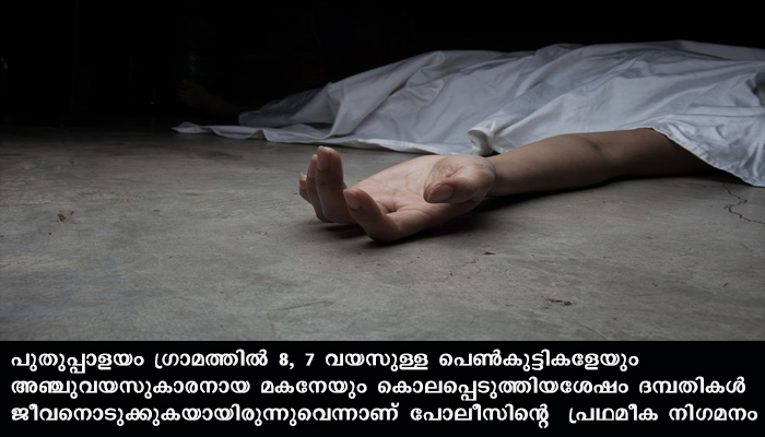 അയല്ക്കാരാണ് ഇവരെ തൂങ്ങിമരിച്ച നിലയില് കണ്ടെത്തിയത്. തുടര്ന്ന് പോലീസില് വിവരമറിയിക്കുകയായിരുന്നു. ഗൃഹനാഥന് വന് സാമ്പത്തിക ബാധ്യതയുണ്ടായിരുന്നതായി വിവരമുണ്ട് . ഇതാണ് മക്കളെ കൊലപ്പെടുത്തി ദമ്പതിമാര് ജീവനൊടുക്കാന് കാരണമായതെന്ന് പോലീസ് പറയുന്നു.
