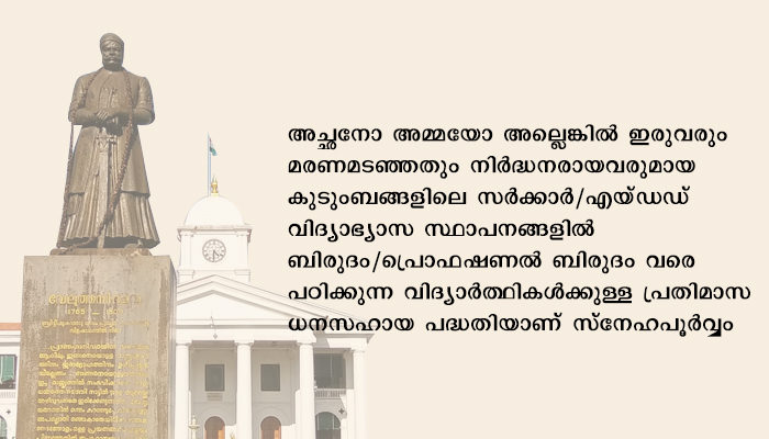 കേരള സാമൂഹ്യ സുരക്ഷാ മിഷൻ മുഖേന നടപ്പിലാക്കുന്ന സ്നേഹപൂർവ്വം പദ്ധതിയിൽ അപേക്ഷ ക്ഷണിച്ചു. അച്ഛനോ അമ്മയോ അല്ലെങ്കിൽ ഇരുവരും മരണമടഞ്ഞതും നിർദ്ധനരായവരുമായ കുടുംബങ്ങളിലെ സർക്കാർ/എയ്ഡഡ് വിദ്യാഭ്യാസ സ്ഥാപനങ്ങളിൽ ബിരുദം/പ്രൊഫഷണൽ ബിരുദം വരെ പഠിക്കുന്ന വിദ്യാർത്ഥികൾക്കുള്ള പ്രതിമാസ ധനസഹായ പദ്ധതിയാണ് സ്നേഹപൂർവ്വം. 2020-21 അദ്ധ്യയന വർഷത്തെ അപേക്ഷ, പദ്ധതി പ്രകാരമുള്ള ആനുകൂല്യം ലഭിക്കുന്നതിന് നിലവിലുള്ള ഗുണഭോക്താക്കളും പുതിയ അപേക്ഷകരും, പഠിക്കുന്ന വിദ്യാഭ്യാസ സ്ഥാപന മേധാവി മുഖേന ഓൺലൈൻ ആയി അപ്ലോഡ് ചെയ്യണം. സ്ഥാപന മേധാവികൾ മുഖേനയല്ലാതെ നേരിട്ടുള്ള അപേക്ഷ പരിഗണിക്കില്ല. ഓൺലൈൻ ആയി അപേക്ഷ സമർപ്പിക്കേണ്ട അവസാന തീയതി ഡിസംബർ 31. കൂടുതൽ വിവരങ്ങൾക്ക്: www.kssm.ikm.in. ടോൾഫ്രീ നമ്പർ 1800-120-1001.