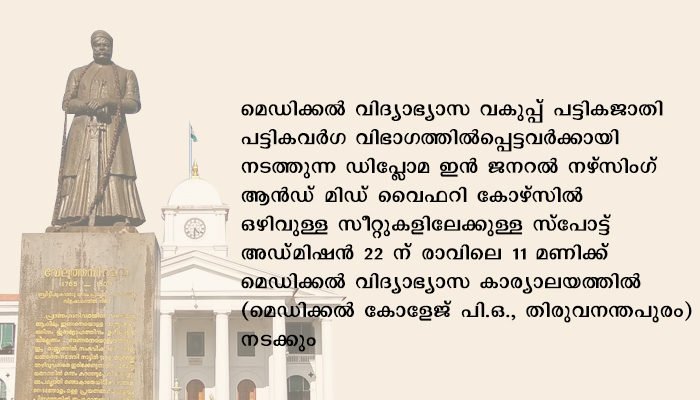 മെഡിക്കൽ വിദ്യാഭ്യാസ വകുപ്പ് പട്ടികജാതി പട്ടികവർഗ വിഭാഗത്തിൽപ്പെട്ടവർക്കായി നടത്തുന്ന ഡിപ്ലോമ ഇൻ ജനറൽ നഴ്‌സിംഗ് ആൻഡ് മിഡ് വൈഫറി കോഴ്‌സിൽ ഒഴിവുള്ള സീറ്റുകളിലേക്കുള്ള സ്‌പോട്ട് അഡ്മിഷൻ 22 ന് രാവിലെ 11 മണിക്ക് മെഡിക്കൽ വിദ്യാഭ്യാസ കാര്യാലയത്തിൽ (മെഡിക്കൽ കോളേജ് പി.ഒ., തിരുവനന്തപുരം) നടക്കും. എസ്.സി വിഭാഗത്തിൽ രണ്ട് ഒഴിവും, എസ്.റ്റി വിഭാഗത്തിൽ നാല് ഒഴിവും ഉണ്ട്. ഇനി റിപ്പോർട്ട് ചെയ്യുന്ന ഒഴിവുകളും സ്‌പോട്ട് അഡ്മിഷനിലൂടെ നികത്തും.