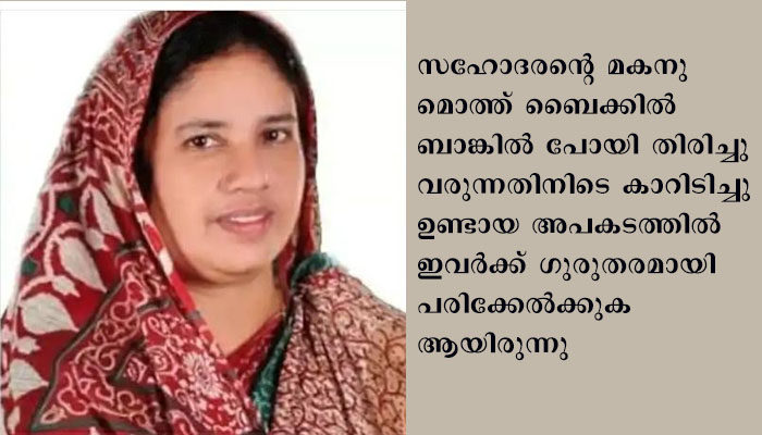 ഡിസംബർ 10 ന് വൈകീട്ട് പാറശ്ശേരിയില് വെച്ചുണ്ടായ വാഹനാപകടത്തില് പരിക്കേറ്റ് കോട്ടക്കല് സ്വകാര്യ ആശുപത്രിയില് ചികില്സയിലായിരുന്ന സഹീറ ബാനു 15/12/20 ചൊവ്വാഴ്ചയാണ് മരിച്ചത്.