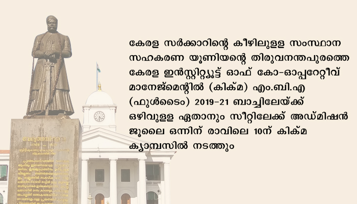 കേരള സർക്കാറിന്റെ കീഴിലുളള സംസ്ഥാന സഹകരണ യൂണിയന്റെ തിരുവനന്തപുരത്തെ കേരള ഇൻസ്റ്റിറ്റ്യൂട്ട് ഓഫ് കോ-ഓപ്പറേറ്റീവ് മാനേജ്മെന്റിൽ (കിക്മ) എം.ബി.എ (ഫുൾടൈം) 2019-21 ബാച്ചിലേയ്ക്ക് ഒഴിവുളള ഏതാനും സീറ്റിലേക്ക് അഡ്മിഷൻ ജൂലൈ ഒന്നിന് രാവിലെ 10ന് കിക്മ ക്യാമ്പസിൽ നടത്തും.