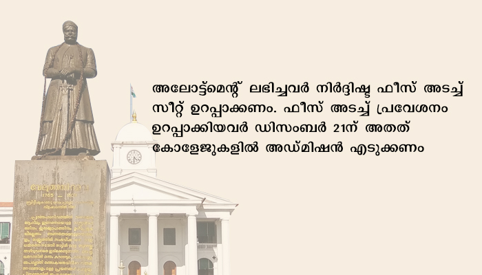 ഡിസംബർ 19ന് നടത്തുന്ന അലോട്ട്മെന്റിൽ പങ്കെടുക്കുവാൻ ആഗ്രഹിക്കുന്നവർ 18ന് ഓൺലൈനായി പുതിയ കോളേജ് ഓപ്ഷനുകൾ നൽകി രജിസ്റ്റർ ചെയ്യണം. മുൻ അലോട്ട്മെന്റുകൾ വഴി സ്വാശ്രയ കോളേജുകളിൽ പ്രവേശനം ലഭിച്ചവർ നിർബന്ധമായും എൻ.ഒ.സി ഓൺലൈൻ രജിസ്ട്രേഷൻ സമയത്ത് അപ്ലോഡ് ചെയ്യണം. ഓപ്ഷനുകൾ പരിഗണിച്ചുകൊണ്ടുള്ള അലോട്ട്മെന്റ് വെബ്സൈറ്റിൽ ഡിസംബർ 19ന് പ്രസിദ്ധീകരിക്കും. കൂടുതൽ വിവരങ്ങൾക്ക്: 0471-2560363, 364.
