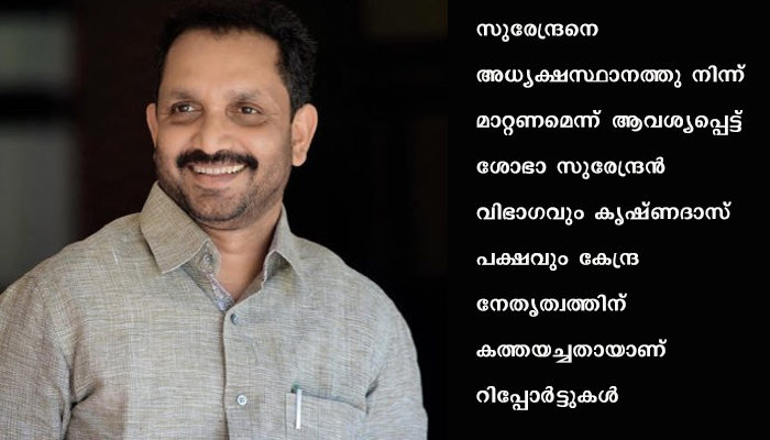 സുരേന്ദ്രനെ അധ്യക്ഷസ്ഥാനത്തുനിന്ന് മാറ്റണമെന്ന് ആവശ്യപ്പെട്ട് ശോഭാ സുരേന്ദ്രന് വിഭാഗവും കൃഷ്ണദാസ് പക്ഷവും കേന്ദ്ര നേതൃത്വത്തിന് കത്തയച്ചതായാണ് റിപ്പോര്ട്ടുകള്. ഇരുവിഭാഗവും വെവ്വേറെ കത്തയച്ചെന്നാണ് വിവരം.