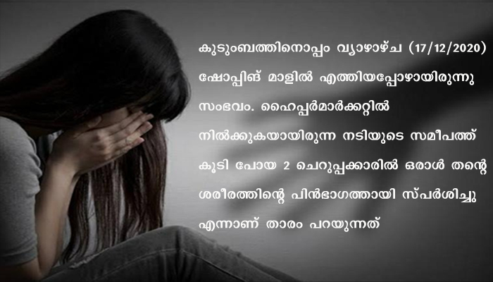 കുടുംബത്തിനൊപ്പം വ്യാഴാഴ്ച ഷോപ്പിങ് മാളില് എത്തിയപ്പോഴായിരുന്നു സംഭവം. ഹൈപ്പര്മാര്ക്കറ്റില് നില്ക്കുകയായിരുന്ന നടിയുടെ സമീപത്ത് കൂടി പോയ രണ്ട് ചെറുപ്പക്കാരില് ഒരാള് തന്റെ ശരീരത്തിന്റെ പിന്ഭാഗത്തായി സ്പര്ശിച്ചു എന്നാണ് താരം പറയുന്നത്.