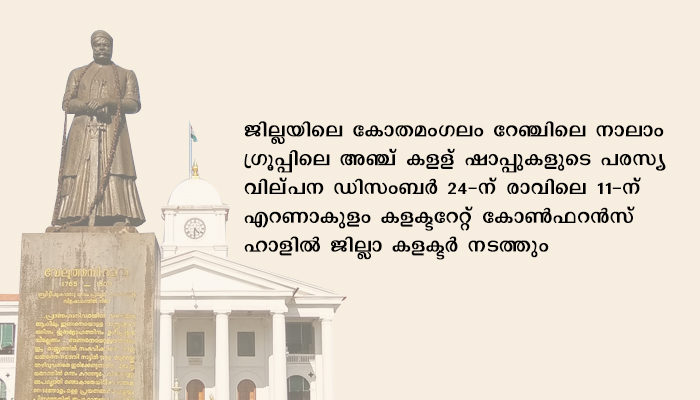 കൊച്ചി: ജില്ലയിലെ കോതമംഗലം റേഞ്ചിലെ നാലാം ഗ്രൂപ്പിലെ അഞ്ച് കളള് ഷാപ്പുകളുടെ പരസ്യ വില്പന ഡിസംബര് 24-ന് രാവിലെ 11-ന് എറണാകുളം കളക്ടറേറ്റ് കോണ്ഫറന്സ് ഹാളില് ജില്ലാ കളക്ടര് നടത്തും.