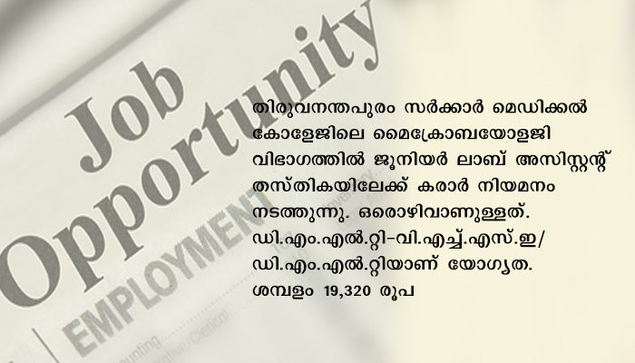 തിരുവനന്തപുരം സർക്കാർ മെഡിക്കൽ കോളേജിലെ മൈക്രോബയോളജി വിഭാഗത്തിൽ ജൂനിയർ ലാബ് അസിസ്റ്റന്റ് തസ്തികയിലേക്ക് കരാർ നിയമനം നടത്തുന്നു. ഒരൊഴിവാണുള്ളത്. ഡി.എം.എൽ.റ്റി-വി.എച്ച്.എസ്.ഇ/ഡി.എം.എൽ.റ്റിയാണ് യോഗ്യത. ശമ്പളം 19,320 രൂപ. കരാർ കാലാവധി ഒരു വർഷമാണ്. നിശ്ചിത യോഗ്യതയുള്ളവർ ജനനതിയതി, വിദ്യാഭ്യാസ യോഗ്യത, മുൻപരിചയം എന്നിവ തെളിയിക്കുന്ന സാക്ഷ്യപ്പെടുത്തിയ പകർപ്പുകൾ സഹിതം 29ന് മുമ്പ് തിരുവനന്തപുരം മെഡിക്കൽ കോളേജ് പ്രിൻസിപ്പലിന്റെ കാര്യാലയത്തിൽ അപേക്ഷിക്കണം.