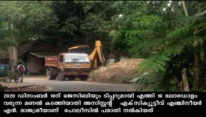 ചേര്ത്തല: ചേര്ത്തല സര്ക്കാര് അതിഥി മന്ദിരത്തിന് സമീപം പൊതുമരാമത്ത് വകുപ്പ് ഓഫീസ് വളപ്പില് സൂക്ഷിച്ചിരുന്ന മണല് കടത്തിയതായി പരാതി . 2020 ഡിസംബര് 10ന് ജെസിബിയും ടിപ്പറുമായി എത്തി 10 ലോഡോളം വരുന്ന മണല് കടത്തിയാതി അസിസ്റ്റന്റ് എക്സിക്യൂട്ടീവ് എഞ്ചിനീയര് എന്. രാജശ്രീയാണ് പോലീസില് പരാതി നൽകിയത്