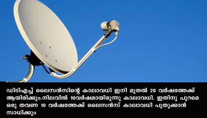 ഡിടിഎച്ച് ലൈസൻസിന്റെ കാലാവധി ഇനി മുതൽ 20 വർഷത്തേക്ക് ആയിരിക്കും.നിലവിൽ 10വർഷമായിരുന്നു കാലാവധി. ഇതിനു പുറമെ ഒരു തവണ 10 വർഷത്തേക്ക് ലൈസൻസ് കാലാവധി പുതുക്കാൻ സാധിക്കും.