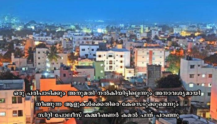 ഒരു പരിപാടിക്കും അനുമതി നൽകിയിട്ടില്ലെന്നും അനാവശ്യമായി നീങ്ങുന്ന ആളുകൾക്കെതിരെ കേസെടുക്കുമെന്നും സിറ്റി പോലീസ് കമ്മീഷണർ കമൽ പന്ത് പറഞ്ഞു.