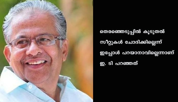 തെരഞ്ഞെടുപ്പില്‍ കൂടുതല്‍ സീറ്റുകള്‍ ചോദിക്കില്ലെന്ന് ഇപ്പോള്‍ പറയാനാവില്ലെന്നാണ് ഇ. ടി പറഞ്ഞത്. ഓരോ രാഷ്ട്രീയ പാര്‍ട്ടികളും അവരുടെ ശക്തിയും അവകാശവുമനുസരിച്ച് സീറ്റുകള്‍ കൂട്ടി ചോദിക്കുമെന്നാണ് ഇ. ടി മുഹമ്മദ് ബഷീര്‍ പറഞ്ഞത്.