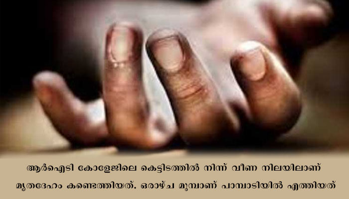 ആര്ഐടി കോളേജിലെ കെട്ടിടത്തില് നിന്ന് വീണ നിലയിലാണ് മൃതദേഹം കണ്ടെത്തിയത്. ഒരാഴ്ച മുമ്പാണ് പാമ്പാടിയില് എത്തിയത്.
