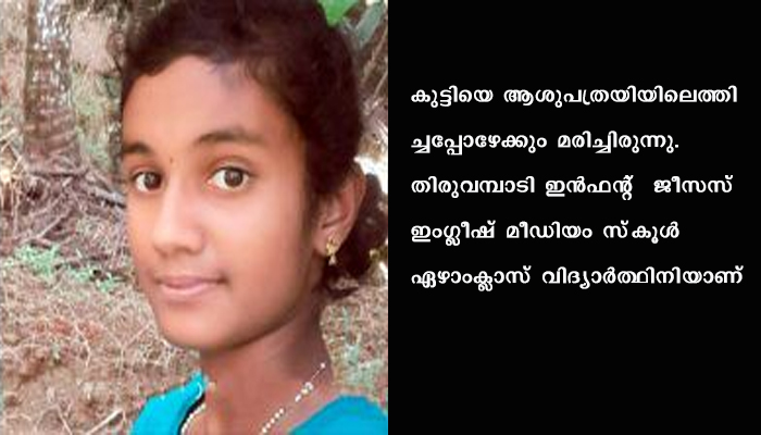 കുട്ടിയെ ആശുപത്രയിയിലെത്തിച്ചപ്പോഴേക്കും മരിച്ചിരുന്നു. തിരുവമ്പാടി ഇന്‍ഫന്റ് ജീസസ് ഇംഗ്ലീഷ് മീഡിയം സ്‌കൂള്‍ ഏഴാംക്ലാസ് വിദ്യാര്‍ത്ഥിനിയാണ്. സഹോദരങ്ങള്‍ ലിയോണ്‍ സാബു, ലിലിയസാബു. സംസ്‌കാരം വിളക്കാംതോട് സെന്റ് സെബാസ്റ്റിയന്‍സ് പളളിയില്‍.