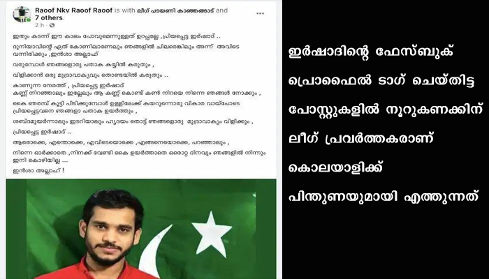 കാസര്‍കോഡ് : കാഞ്ഞങ്ങാട്ടെ ഡിവൈഎഫ്ഐ പ്രവര്‍ത്തകന്‍ അബ്ദുറഹ്മാന്‍ ഔഫിനെ കുത്തികൊലപ്പെടുത്തിയവരെ ന്യായീകരിച്ച് സോഷ്യൽ മീഡിയയിൽ യൂത്ത് ലീഗ് പ്രവർത്തകർ. യൂത്ത് ലീഗ് പ്രസിഡന്റ് മുനവ്വറലി ശിഹാബ് തങ്ങള്‍ തള്ളിപ്പറഞ്ഞിട്ടും ഒന്നാം പ്രതി ഇര്‍ഷാദിനും മറ്റുള്ള പ്രതികള്‍ക്കും പിന്തുണകളുമായി കാസര്‍കോഡ് യൂത്ത് ലീഗ് പ്രവര്‍ത്തകര്‍ സാമൂഹിക മാധ്യമങ്ങളില്‍ കാംപയിന്‍ സജീവമാക്കിയിട്ടുണ്ട്. ഇര്‍ഷാദിന്റെ ഫേസ്ബുക് പ്രൊഫൈല്‍ ടാഗ് ചെയ്തിട്ട പോസ്റ്റുകളില്‍ നൂറുകണക്കിന് ലീഗ് പ്രവര്‍ത്തകരാണ് കൊലയാളിക്ക് പിന്തുണയുമായി എത്തുന്നത്.