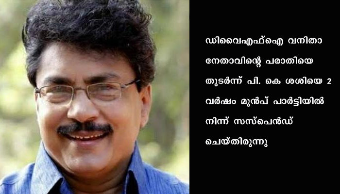 2019 നവംബർ 26നാണ് പി.കെ ശശിയെ സിപിഐഎം സസ്പെൻഡ് ചെയ്തത്. ഡിവൈഎഫ്ഐ പാലക്കാട് ജില്ലാ കമ്മിറ്റി അംഗമായ യുവതി നല്കിയ പരാതി അന്വേഷിച്ച കേന്ദ്ര കമ്മറ്റിയംഗങ്ങളായ എ കെ ബാലൻ, പി കെ ശ്രീമതി എന്നിവരുടെ ശുപാർശയുടെ അടിസ്ഥാനത്തിലായിരുന്നു നടപടി. ലൈംഗിക അതിക്രമം ഉണ്ടായിട്ടില്ലെന്നും ഫോണിലൂടെ മോശമായി സംസാരിച്ചതിന് നടപടിയെടുക്കാമെന്നുമായിരുന്നു കമ്മീഷന്റെ ശുപാര്ശ. ശശിക്കെതിരെയുള്ള നടപടി സിപിഐഎം ജില്ലാ നേതാക്കൾക്കിടയിൽ കടുത്ത ഭിന്നത സൃഷ്ടിച്ചിരുന്നു.