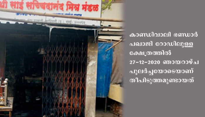 മുംബൈ: സായ്ബാബ ക്ഷേത്രത്തിലുണ്ടായ തീപിടുത്തത്തില് രണ്ട് പേര് മരിച്ചു. ഗുരുതരമായി പൊള്ളലേറ്റ ഒരാളെ ആശുപത്രിയില് പ്രവേശിപ്പിച്ചു. കാണ്ഡിവാലി ഭണ്ഡാര് പഖാജി റോഡിലുള്ള ക്ഷേത്രത്തിൽ 27-12-2020 ഞായറാഴ്ച പുലര്ച്ചയോടെയാണ് തീപിടുത്തമുണ്ടായത്. ഷോര്ട്ട് സര്ക്യൂട്ടാണ് അപകടത്തിനിടയാക്കിയതെന്നാണ് റിപ്പോർട്ട്.