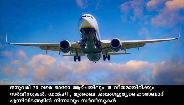 ജനുവരി 23 വരെ ഓരോ ആഴ്ചയിലും 15 വീതമായിരിക്കും സര്‍വീസുകള്‍. ഡല്‍ഹി , മുംബൈ ,ബെംഗളൂരു,ഹൈദരാബാദ് എന്നിവിടങ്ങളില്‍ നിന്നാവും സര്‍വീസുകള്‍. സര്‍വീസുകളുടെ വിശദാംശങ്ങള്‍ ഡിജിസിഎ ഉടന്‍ നല്‍കുമെന്നും അദ്ദേഹം വ്യക്തമാക്കി. ഡിസംബര്‍ 22 മുതല്‍ 31 വരെയായിരുന്നു വിലക്ക്. പിന്നീട് ജനുവരി 8 വരെ നീട്ടുകയായിരുന്നു.