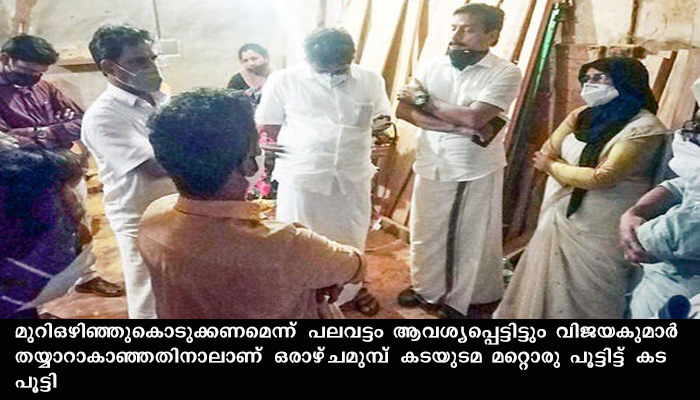 അതുവരെ കട വാടകക്കാര് തുറക്കാമെന്നും തീരുമാനിച്ചു. കടമുറികള് ഉള്പ്പെടുന്ന കെട്ടിടം ഉടമ ഏതാനം മാസം മുമ്പ് വില്പ്പന നടത്തിയതാണ്. ഇതേ തുടര്ന്ന് വാടകക്കാരന് മുറി ഒഴിയുകയും യന്ത്രങ്ങള് മാറ്റുകയും ചെയ്തിരുന്നു. എന്നാല് ഇപ്പോള് ആനുകൂല്ല്യം ആവശ്യപ്പെട്ടാണ് തിരികെ വന്നിരിക്കുന്നതെന്ന് കെട്ടിട ഉടമ പറഞ്ഞു. എന്നാല് മുറികള് പൂട്ടിയിട്ടതിനാല് ഒരാഴ്ച പണിയെടുക്കാന് കഴിഞ്ഞില്ലെന്നാണ് വിജയകുമാര് പറയുന്നത്.