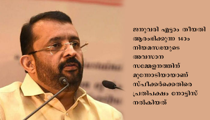 ജനുവരി എട്ടാം തീയതി ആരംഭിക്കുന്ന 14-ാം നിയമസഭയുടെ അവസാന സമ്മേളനത്തിന് മുന്നോടിയായാണ് സ്പീക്കർക്കെതിരെ പ്രതിപക്ഷം നോട്ടിസ് നൽകിയത്. സമാന ആവശ്യമുന്നയിച്ച് നല്കിയ നോട്ടിസ് നേരത്തേ തള്ളിയിരുന്നു. സര്ക്കാരിനെതിരായ അവിശ്വാസ പ്രമേയ നോട്ടിസിനൊപ്പമാണ് സ്പീക്കറെ നീക്കണമെന്ന് ആവശ്യപ്പെട്ടുള്ള നോട്ടിസ് പ്രതിപക്ഷം ആദ്യം നല്കിയത്. പതിനാല് ദിവസം മുന്പ് നോട്ടിസ് നല്കണമെന്ന ചട്ടം ചൂണ്ടിക്കാട്ടി അന്ന് നോട്ടിസ് തള്ളുകയായിരുന്നു.