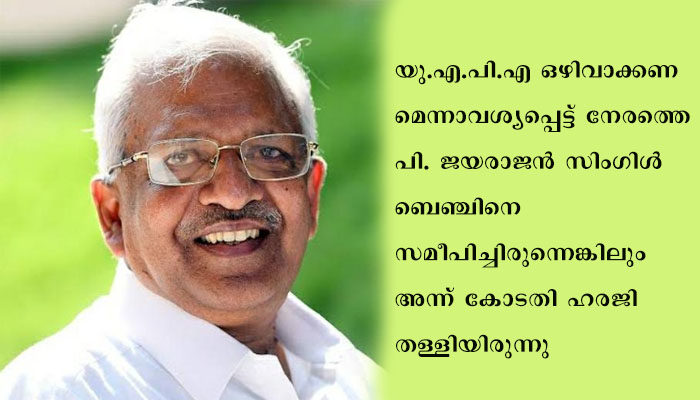 യു.എ.പി.എ ഒഴിവാക്കണമെന്നാവശ്യപ്പെട്ട് നേരത്തെ പി. ജയരാജന് സിംഗിള് ബെഞ്ചിനെ സമീപിച്ചിരുന്നെങ്കിലും അന്ന് കോടതി ഹരജി തള്ളിയിരുന്നു. ഇതിനെതിരെയാണ് പി.ജയരാജന് ഡിവിഷന് ബെഞ്ചിനെ സമീപിച്ചത്. എന്നാല് ഡിവിഷന് ബെഞ്ചും ഹരജി തള്ളുകയാണുണ്ടായത്.