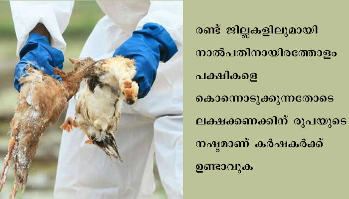 താറാവുകള്ക്ക് പുറമേ രോഗം സ്ഥിരീകരിച്ച പ്രദേശത്തെ ഒരു കിലോമീറ്റര് ചുറ്റളവിലുള്ള വളര്ത്തു പക്ഷികളെയും കൊന്നൊടുക്കുകയാണ്. ആലപ്പുഴ ജില്ലയിലെ കരുവാറ്റ ഉള്പ്പെടെ നാല് പഞ്ചായത്തുകളിലും കോട്ടയം ജില്ലയിലെ നീണ്ടൂര് പഞ്ചായത്തിലെ പതിനാലാം വാര്ഡിലുമാണ് നിലവില് പ്രതിരോധ നടപടികള് തുടങ്ങിയിട്ടുള്ളത്. രണ്ട് ജില്ലകളിലുമായി നാല്പതിനായിരത്തോളം പക്ഷികളെ കൊന്നൊടുക്കുന്നതോടെ ലക്ഷക്കണക്കിന് രൂപയുടെ നഷ്ടമാണ് കര്ഷകര്ക്ക് ഉണ്ടാവുക.