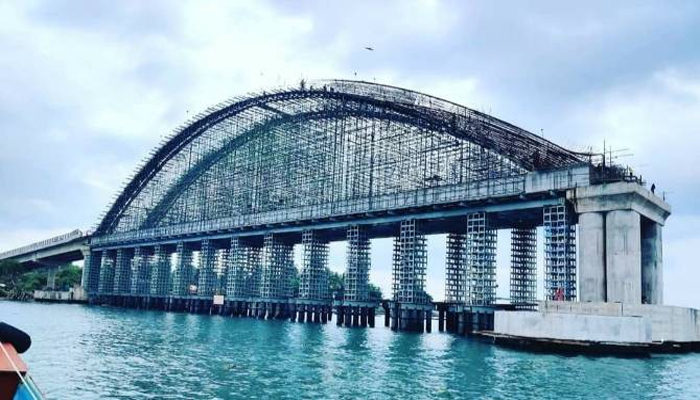 2016 ഫെബ്രുവരിയില് ഭരണാനുമതി ലഭിച്ച പാലത്തിന്റെ നിര്മാണ പ്രവര്ത്തികള് അതേ വര്ഷം തന്നെ മാര്ച്ച് 4 ന് ആരംഭിക്കുകയും ചെയ്തിരുന്നു. 976 മീറ്റര് നീളത്തില് 140 കോടി രൂപ വിനിയോഗിച്ച് 29 സ്പാനുകളോടെയാണ് പാലം നിര്മ്മാണം പുരോഗമിക്കുന്നത്. ഇതില് 110 മീറ്ററിന്റെ ബോസ്ട്രിങ് ആര്ച്ച് മാതൃകയിലുള്ള 3 സ്പാനുകള് കായലിനു കുറുകെയാണ്. ദക്ഷിണേഷ്യയിലെ തന്നെ ഏറ്റവും നീളം കൂടിയ ബോസ്ട്രിങ് ആര്ച്ചാണ് പാലത്തിന്റെ പ്രധാന ആകര്ഷണങ്ങളില് ഒന്ന്. കൂടാതെ 37 മീറ്റര് നീളമുള്ള 13 സ്പാനുകളും 12 മീറ്റര് നീളമുള്ള 13 സ്പാനുകളും ഉള്പ്പെടെയാണ് പാലം നിര്മ്മിക്കുന്നത്. നിലവില്പാലത്തിന്റെ 75 ശതമാനത്തോളം പ്രവര്ത്തികള് പൂര്ത്തീകരിച്ചിട്ടുണ്ടെന്നും രണ്ടുമാസത്തിനുള്ളില് പാലം ഗതാഗതത്തിന് പൂര്ണ സജ്ജമാക്കാന് സാധിക്കുമെന്നാണ് കരുതുന്നതെന്ന് പി ഡബ്ലിയു ഡി ബ്രിഡ്ജസ് വിഭാഗം അറിയിച്ചു.