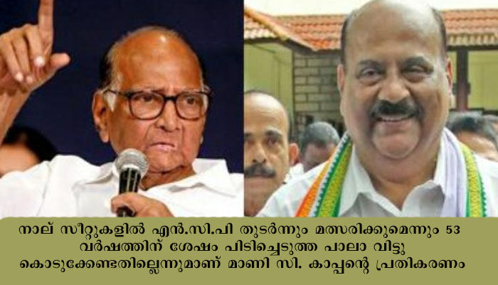 നാല് സീറ്റുകളില് എന്.സി.പി തുടര്ന്നും മത്സരിക്കുമെന്നും 53 വര്ഷത്തിന് ശേഷം പിടിച്ചെടുത്ത പാലാ വിട്ടുകൊടുക്കേണ്ടതില്ലെന്നുമാണ് മാണി സി. കാപ്പന്റെ പ്രതികരണം. ശരദ് പവാറുമായുള്ള കൂടിക്കാഴ്ചയ്ക്ക് ശേഷം വ്യാഴാഴ്ച(07/01/21) രാവിലെ മാധ്യമങ്ങളോട് സംസാരിക്കുകയായിരുന്നു ഇരുവരും.