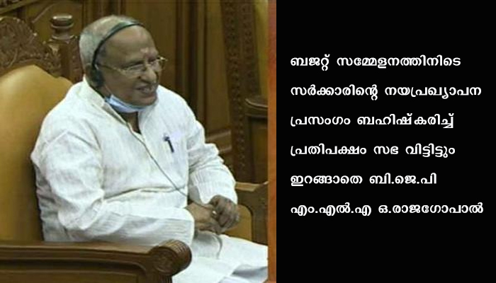 തിരുവനന്തപുരം: ബജറ്റ് സമ്മേളനത്തിനിടെ സര്ക്കാരിന്റെ നയപ്രഖ്യാപന പ്രസംഗം ബഹിഷ്കരിച്ച് പ്രതിപക്ഷം സഭ വിട്ടിട്ടും ഇറങ്ങാതെ ബി.ജെ.പി എം.എല്.എ ഒ.രാജഗോപാല്.