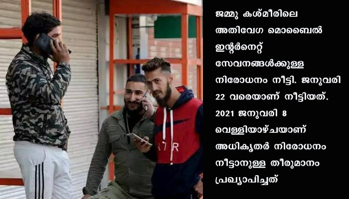 ശ്രീനഗർ: ജമ്മു കശ്മീരിലെ അതിവേഗ മൊബൈൽ ഇന്റർനെറ്റ് സേവനങ്ങൾക്കുള്ള നിരോധനം നീട്ടി. ജനുവരി 22 വരെയാണ് നീട്ടിയത്. 2021 ജനുവരി 8 വെള്ളിയാഴ്ചയാണ് അധികൃതർ നിരോധനം നീട്ടാനുള്ള തീരുമാനം പ്രഖ്യാപിച്ചത്. ഗണ്ടർബാൽ, ഉദംപൂർ ജില്ലകളെ ഇതിൽ നിന്നും ഒഴിവാക്കിയിട്ടുണ്ട്.