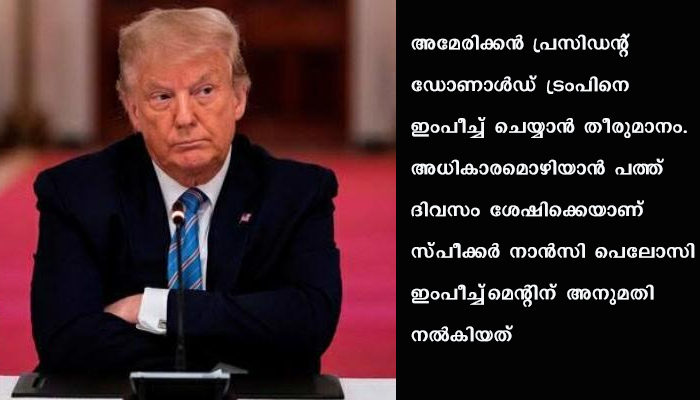 വാഷിങ്ടൺ: അമേരിക്കന് പ്രസിഡന്റ് ഡോണാള്ഡ് ട്രംപിനെ ഇംപീച്ച് ചെയ്യാന് തീരുമാനം. അധികാരമൊഴിയാന് പത്ത് ദിവസം ശേഷിക്കെയാണ് സ്പീക്കര് നാന്സി പെലോസി ഇംപീച്ച്മെന്റിന് അനുമതി നല്കിയത്. ട്രംപ് രാജി വച്ച് സ്ഥാനം ഒഴിഞ്ഞില്ലെങ്കില് ഇംപീച്ച് ചെയ്യുമെന്ന് സ്പീക്കര് അറിയിച്ചു. ഇംപീച്ച്മെന്റ് പ്രമേയത്തിന് അനുമതി നല്കിയതായി സ്പീക്കര്. അമേരിക്കന് കോണ്ഗ്രസില് ഡെമോക്രാറ്റിക് പാര്ട്ടിയാണ് പ്രമേയം അവതരിപ്പിക്കുക.