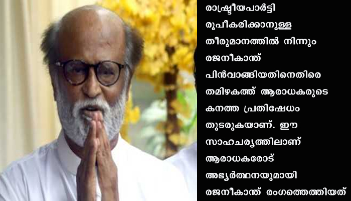 രാഷ്ട്രീയപാര്ട്ടി രൂപീകരിക്കാനുള്ള തീരുമാനത്തില് നിന്നും രജനീകാന്ത് പിന്വാങ്ങിയതിനെതിരെ തമിഴകത്ത് ആരാധകരുടെ കനത്ത പ്രതിഷേധം തുടരുകയാണ്. ഈ സാഹചര്യത്തിലാണ് ആരാധകരോട് അഭ്യര്ത്ഥനയുമായി രജനീകാന്ത് രംഗത്തെത്തിയത്.