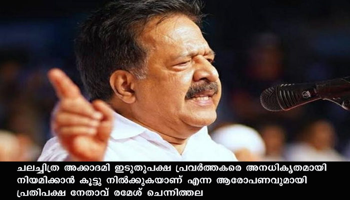 തിരുവനന്തപുരം: ചലച്ചിത്ര അക്കാദമി ഇടുതുപക്ഷ പ്രവര്ത്തകരെ അനധികൃതമായി നിയമിക്കാന് കൂട്ടു നില്ക്കുകയാണ് എന്ന ആരോപണവുമായി പ്രതിപക്ഷ നേതാവ് രമേശ് ചെന്നിത്തല.