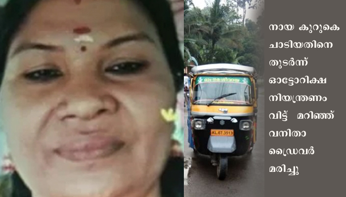 കുറുവിലങ്ങാട്: നായ കുറുകെ ചാടിയതിനെത്തുടര്ന്ന് ഓട്ടോറിക്ഷ നിയന്ത്രണം വിട്ട് മറിഞ്ഞ് വനിതാ ഡ്രൈവര് മരിച്ചു. ഉഴവൂര് കരിനെച്ചി ശങ്കരാശേരിയില് സോമന്റെ ഭാര്യ വിജയമ്മ(50) ആണ് മരിച്ചത്.
