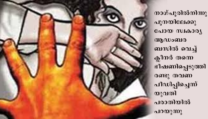 നാഗ്പൂരില്നിന്നു പൂനയിലേക്കു പോയ സ്വകാര്യ ആഡംബര ബസിൽ വെച്ച് ക്ലീനർ തന്നെ ഭീഷണിപ്പെടുത്തി രണ്ടു തവണ പീഡിപ്പിച്ചെന്ന് യുവതി പരാതിയിൽ പറയുന്നു.