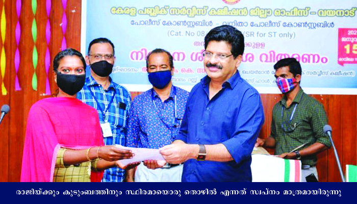 വയനാട്: പുൽപ്പള്ളി പാളക്കൊല്ലി നിവാസി സി.കെ. രാജി നിയമന ഉത്തരവ് കൈപ്പറ്റിയപ്പോൾ യാഥാർത്ഥ്യമായത് കാലങ്ങളായി കാത്തിരുന്ന സ്വപ്നമാണ്. കൂലിപ്പണി ചെയ്ത് ഉപജീവനം മാർഗം കണ്ടെത്തിയിരുന്ന രാജിയ്ക്കും കുടുംബത്തിനും സ്ഥിരമായൊരു തൊഴിൽ എന്നത് സ്വപ്നം മാത്രമായിരുന്നു. എന്നാൽ സർക്കാർ സംവിധാനമായ പോലീസ് വകുപ്പിൽ നിയമനം ലഭിച്ചത് അഭിമാന നിമിഷം തന്നെയായി. 23 കാരിയായ രാജിയ്ക്ക് രണ്ട് സഹോദരിമാരാണുള്ളത്. അവരുടെ പഠനവും ഇനി രാജിയുടെ കൈകളിൽ ഭദ്രമാണ്.