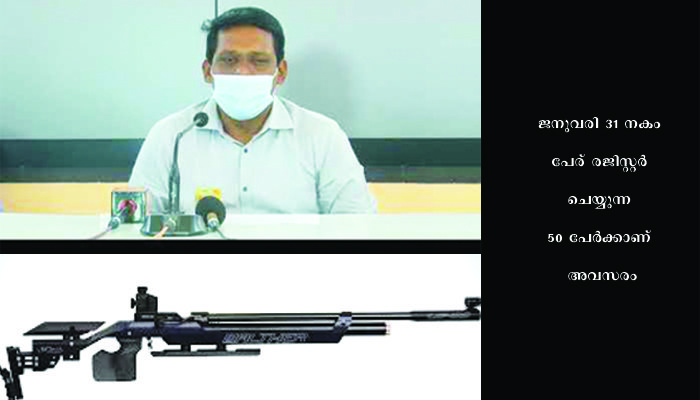 ജനുവരി 31 നകം പേര് രജിസ്റ്റര് ചെയ്യുന്ന 50 പേര്ക്കാണ് അവസരം. ജനുവരി 31 നകം 9447006994 എന്ന നമ്പറില് പേര്, വയസ്, ആധാര് കോപ്പി, പങ്കെടുക്കുന്ന മത്സര വിഭാഗം എന്നീ വിവരങ്ങള് വാട്സഅപ്പ് ചെയ്യണം. 18 മുതല് 50 വയസുവരെയുള്ള സ്വന്തമായി തോക്കുള്ളവര്ക്ക് എയര് റൈഫിള് പിസ്റ്റള് വിഭാഗത്തിലും 22 റൈഫിള് വിഭാഗത്തിലും പങ്കെടുക്കാം. പത്രസമ്മേളനത്തില് റൈഫിള് അസോസിയേഷന് ജില്ലാ സെക്രട്ടറി കെ എ നാസര് കാഞ്ഞങ്ങാട്, ജോ. സെക്രട്ടറി വി വി രാജേന്ദ്രകുമാര്, ട്രഷറര് എ കെ ഫൈസല് എന്നിവര് സംബന്ധിച്ചു.