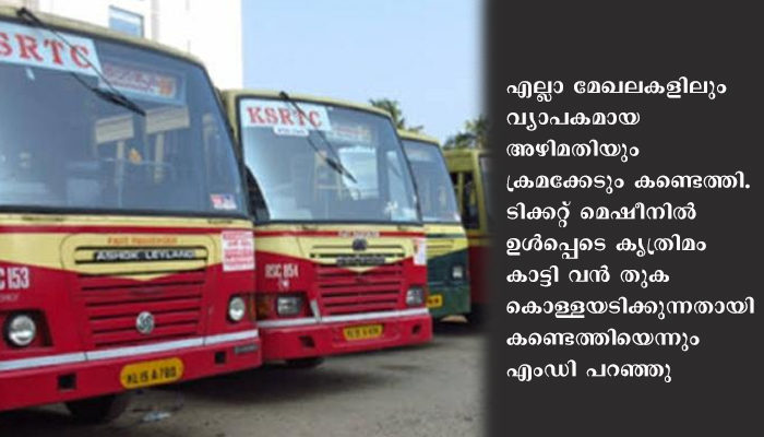 അതേസമയം കെഎസ്ആര്ടിസിയില് അടിമുടി അഴിച്ചുപണി ആവശ്യമെന്ന് മാനേജിംഗ് ഡയറക്ടര് ബിജു പ്രഭാകര് തുറന്നടിച്ചു. എല്ലാ മേഖലകളിലും വ്യാപകമായ അഴിമതിയും ക്രമക്കേടും കണ്ടെത്തി. ടിക്കറ്റ് മെഷീനില് ഉള്പ്പെടെ കൃത്രിമം കാട്ടി വന് തുക കൊള്ളയടിക്കുന്നതായി കണ്ടെത്തിയെന്നും എംഡി പറഞ്ഞു.