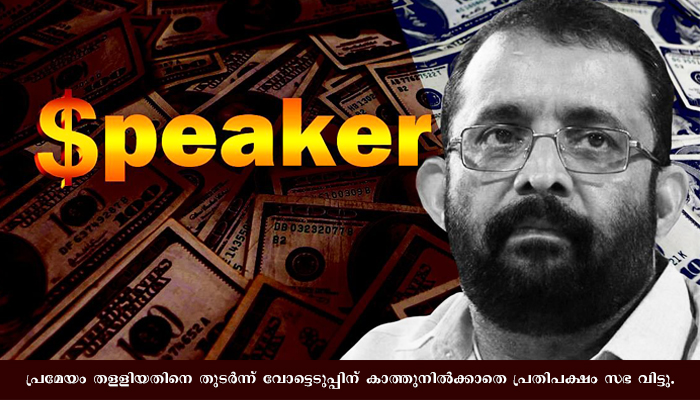 പ്രമേയം തളളിയതിനെ തുടര്ന്ന് വോട്ടെടുപ്പിന് കാത്തുനില്ക്കാതെ പ്രതിപക്ഷം സഭ വിട്ടു. സ്പീക്കറുടെ സ്ഥാനത്ത് നിന്ന് പി. ശ്രീരാമകൃഷ്ണന് മാറിനില്ക്കുമെന്ന് പറയുമെന്നാണ് തങ്ങള് കരുതിയതെന്നും അത് പറയാത്തതില് പ്രതിഷേധിച്ച് നിയമസഭയില് നിന്ന് ഇറങ്ങിപ്പോകുകയാണെന്നും പ്രതിപക്ഷ നേതാവ് രമേശ് ചെന്നിത്തല പറഞ്ഞു. തനിക്കെതിരെയുള്ള ആരോപണങ്ങള്ക്ക് എണ്ണി എണ്ണി സ്പീക്കര് ശ്രീരാമകൃഷ്ണന് മറുപടി നല്കി. പ്രതിപക്ഷത്തെ കടന്നാക്രമിച്ചുള്ള കൃത്യതയും വ്യക്തതയുമുള്ള മറുപടിയായിരുന്നു അദ്ദേഹത്തിന്റേത്. ഇത് പ്രതിപക്ഷത്തെ ചൊടിപ്പിക്കുകയും ചെയ്തു. ശ്രീരാമകൃഷ്ന്റെ മറുപടി പ്രസംഗം കഴിഞ്ഞ സെക്കന്റില് തന്നെ പ്രതിപക്ഷ നേതാവ് രമേശ് ചെന്നിത്തല എഴുന്നേറ്റ് ഇറങ്ങിപ്പോക്ക് പ്രഖ്യാപിക്കുകയായിരുന്നു. 17വര്ഷങ്ങള്ക്ക് ശേഷമാണ് സ്പീക്കറെ നീക്കണമെന്നാവശ്യപ്പെട്ട് ഒരു പ്രമേയം ചര്ച്ചയ്ക്ക് വരുന്നത്. രണ്ടുമണിക്കൂറായിരുന്നു പ്രമേയത്തിന്മേലുളള ചര്ച്ചക്കായി അനുവദിച്ചത്. എന്നാല് ചര്ച്ച മൂന്നേമുക്കാല് മണിക്കൂറോളം നീണ്ടു.