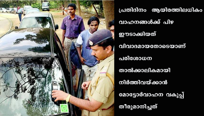 ഇതിന്റെ അടിസ്ഥാനത്തില് മോട്ടോര്വാഹന വകുപ്പ് 2021 ജനുവരി 17 ഞായറാഴ്ചമുതലാണ് പരിശോധന ആരംഭിച്ചത്. പ്രതിദിനം ആയിരത്തിലധികം വാഹനങ്ങള്ക്ക് പിഴ ഈടാക്കിയത് വിവാദമായതോടെയാണ് പരിശോധന താല്ക്കാലികമായി നിര്ത്തിവയ്ക്കാന് മോട്ടോര്വാഹന വകുപ്പ് തീരുമാനിച്ചത്. വാഹന ഉടമകള് നിയമം കര്ശനമായി പാലിക്കണമെന്ന് ഗതാഗത കമ്മീഷണര് ആവശ്യപ്പെട്ടു.
