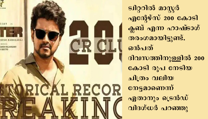 ട്വിറ്ററിൽ മാസ്റ്റർ എന്റേഴ്സ് 200 കോടി ക്ലബ് എന്ന ഹാഷ്‌ടാഗ് തരംഗമായിട്ടുണ്ട്. ഒൻപത് ദിവസത്തിനുള്ളിൽ 200 കോടി രൂപ നേടിയ ചിത്രം വലിയ നേട്ടമാണെന്ന് ഏതാനും ട്രെൻഡ് വിദഗ്ധർ പറഞ്ഞു. എന്നിരുന്നാലും, സിനിമയുടെ ബിസിനസ്സ് നമ്പറുകളെക്കുറിച്ച് ചിത്രത്തിൻ്റെ ടീം ഔദ്യോഗികമായി ഒന്നും പ്രഖ്യാപിച്ചിട്ടില്ല