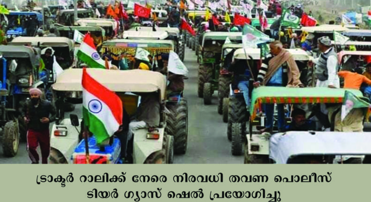 സിന്ഗുവിലെ കര്ണല് ബൈപ്പാസിൽ പൊലീസ് കര്ഷകരുമായി ഏറ്റുമുട്ടി. ഷാജഹാന്പൂരില് ട്രാക്ടര് റാലി തടയാന് പൊലീസ് ഉയര്ത്തിയ ബാരിക്കേടുകള് പൊളിച്ച് നീക്കിയാണ് റാലി മുന്നോട്ട് നീങ്ങിയത്. നേരത്തേ പൊലീസുമായു ണ്ടാക്കിയ കരാർ പ്രകാരം നിശ്ചയിച്ച സമയത്തിലും നേരത്തേ റാലി തുടങ്ങിയതിനാലാണ് പൊലീസ് തടഞ്ഞത്.