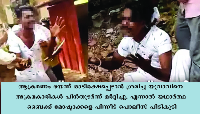 ജനുവരി 24ന് ഉച്ചയ്ക്കാണ് സംഭവം നടക്കുന്നത്. ബൈക്ക് മോഷ്ടാവല്ലെന്ന് ആവർത്തിച്ചിട്ടും ക്രൂരമർദ്ദനം തുടർന്നു. ആക്രമണം ഭയന്ന് ഓടിരക്ഷപ്പെടാൻ ശ്രമിച്ച യുവാവിനെ അക്രമകാരികൾ പിൻതുടർന്ന് മർദ്ദിച്ചു. എന്നാൽ യഥാര്‍ത്ഥ ബൈക്ക് മോഷ്ടാക്കളെ പിന്നീട് പൊലീസ് പിടികൂടി.