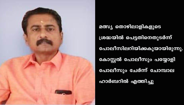 പയ്യോളി: കാണാതായ കോട്ടക്കല് കൂടത്താഴ ഉമേദന്റെ (50) മൃതദേഹം കണ്ടെത്തി. ചൊവ്വാഴ്ച (26.01.2020 ) വൈകുന്നേരത്തോടെ ആഴക്കലിലാണ് മൃതദേഹം കണ്ടത്. ഇരിങ്ങല് കോട്ടക്കലിലെ മണല്വാരല് തൊഴിലാളിയാണ്. മത്സ്യ തൊഴിലാളികളുടെ ശ്രദ്ധയില് പെട്ടതിനെതുടര്ന്ന് പോലീസിലറിയിക്കകുയായിരുന്നു. കോസ്റ്റല് പോലീസും പയ്യോളി പോലീസും ചേര്ന്ന് ചോമ്പാല ഹാര്ബറില് എത്തിച്ചു.