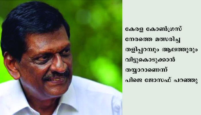 കേരള കോണ്ഗ്രസ് നേരത്തെ മത്സരിച്ച തളിപ്പറമ്പും ആലത്തൂരും വിട്ടുകൊടുക്കാന് തയ്യാറാണെന്ന് പിജെ ജോസഫ് പറഞ്ഞു. അതേ സമയം കോട്ടയം ജില്ലകളിലെയും മറ്റുള്ള സീറ്റുകളിലും വിട്ടുവീഴ്ചക്കുള്ള ലക്ഷണം ജോസഫ് കാണിച്ചില്ല.