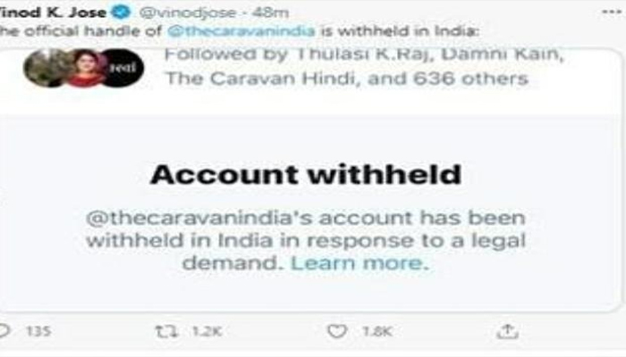 അക്കൗണ്ട് തടഞ്ഞുവെച്ച കാര്യം അക്കൗണ്ടിന്റെ സ്ക്രീന്ഷോട്ട് സഹിതം കാരവന്റെ എക്സിക്യൂട്ടീവ് എഡിറ്റര് വിനോദ് കെ. ജോസ് ആണ് അദ്ദേഹത്തിന്റെ ട്വിറ്ററിലൂടെ അറിയിച്ചത്. ട്വിറ്ററിന്റെ നടപടിക്കെതിരെ നിരവധിപേര് വിമര്ശനവുമായി രംഗത്തെത്തിയിട്ടുണ്ട്.